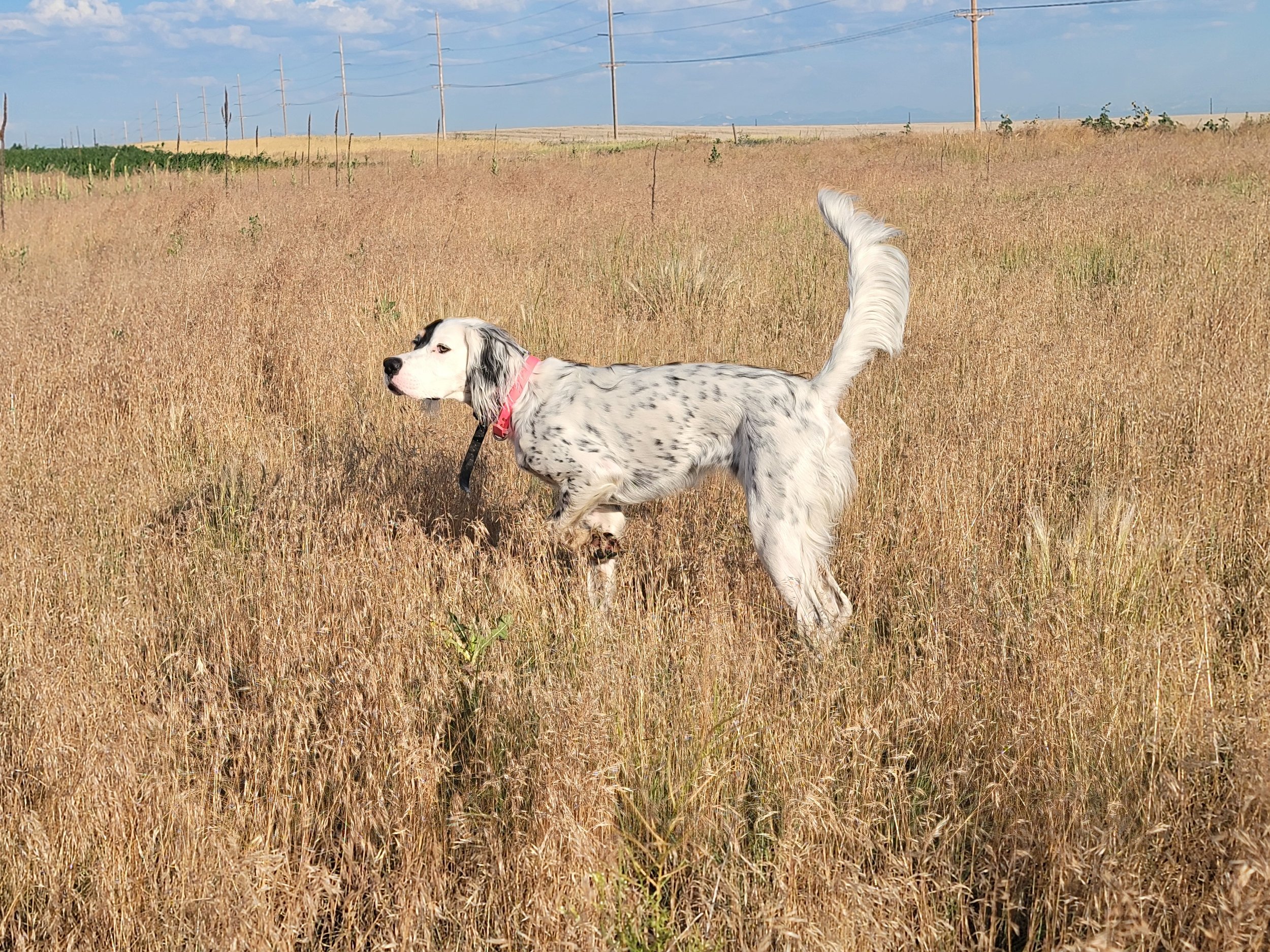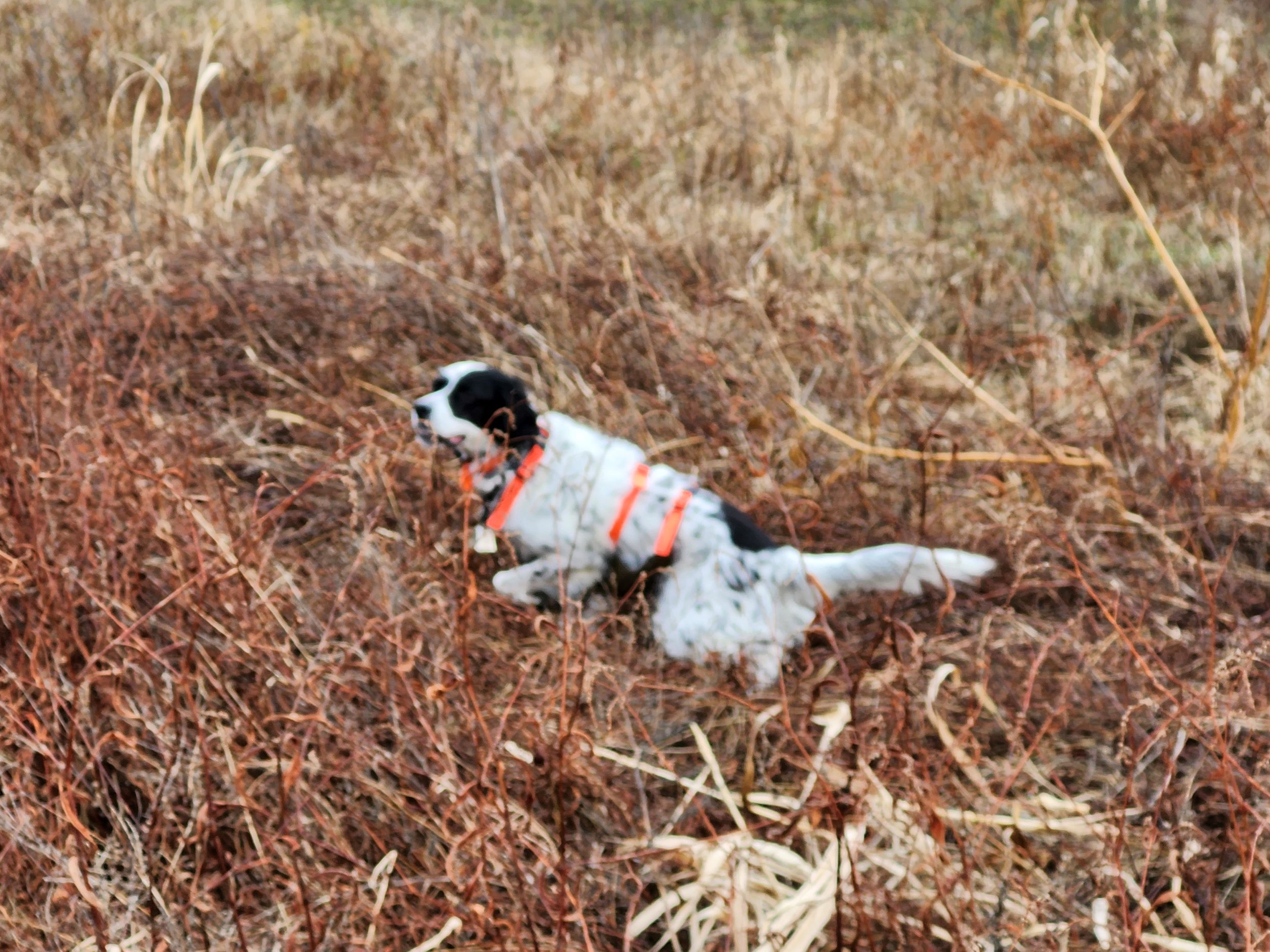 This past weekend I went out with her and a friend and she was fantastic. We were in a field where a driven shoot had taken place earlier so a fair amount of leftover birds. Her nose is amazing - her points were strong and when she went rock solid, there was always a bird there, even if very well hidden! And while she won't retrieve yet, she does chase and keep an eye on the bird until I come and get it - hope with training this summer she can learn to retrieve as well. Again, she worked for near 3 hours without a break - her choice! I can tell that she truly loves being in the field.